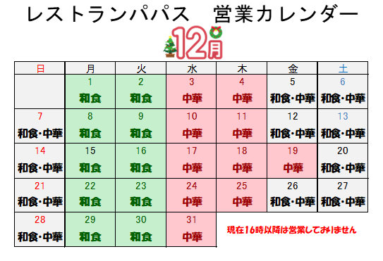 ⛄12月レストランカレンダー⛄